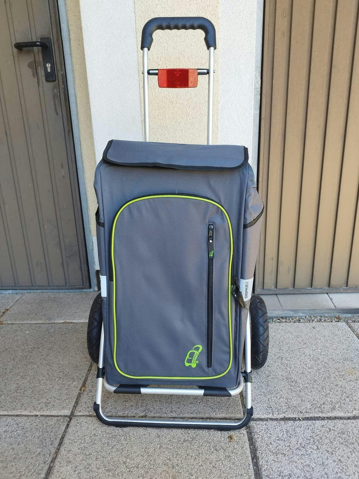 Passt in den Kofferraum meines Autos. Allerdings ist das Hinein- und Herausheben in beladenem Zustand auch schwer. Ich mache das jetzt so, dass ich die Waren vom Supermarktwagen in eine Klappkiste tue und dann zu Hause in den Shopper lade, wenn dieser neben dem Auto steht. Dann muss ich auf dem sandigen Weg (eigentlich Recyclingmaterial, das nicht fest wird) mehrere hundert Meter gehen, das geht gut und dann über 2 Stockwerke den Wagen ziehen. Treppensteigen funktioniert mit drei Rädern gut. Ist aber trotzdem anstrengend zum Hochziehen. Aber leichter als 2 mal die Klappkiste hochzutragen.